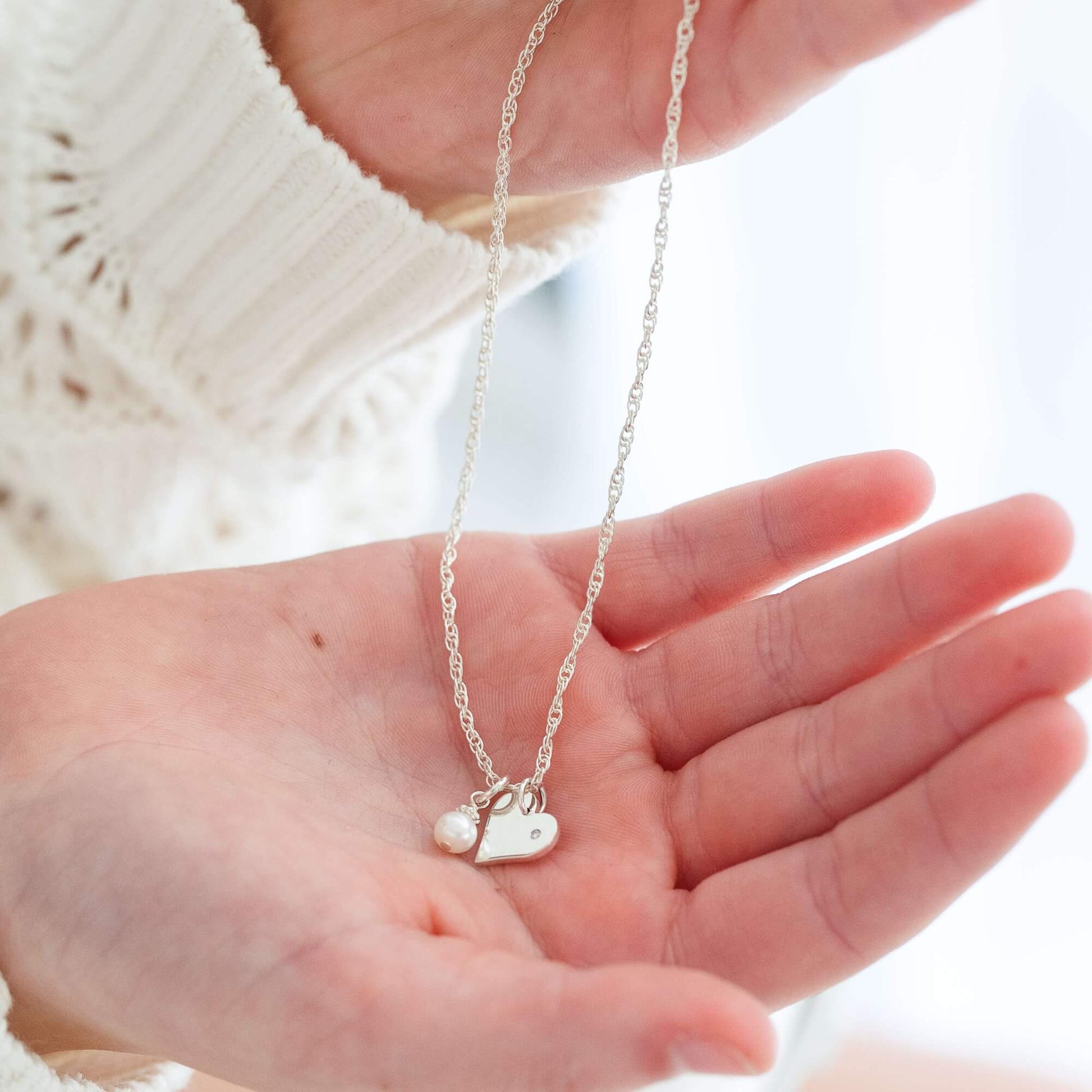 This necklace features both the heart charm AND a sweet and classic pearl charm. You can choose additional accent charms below if you'd like to add something extra special to celebrate her unique personality.