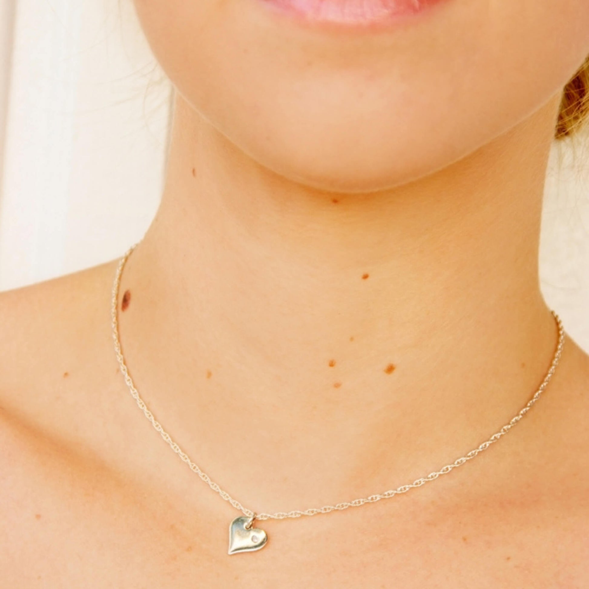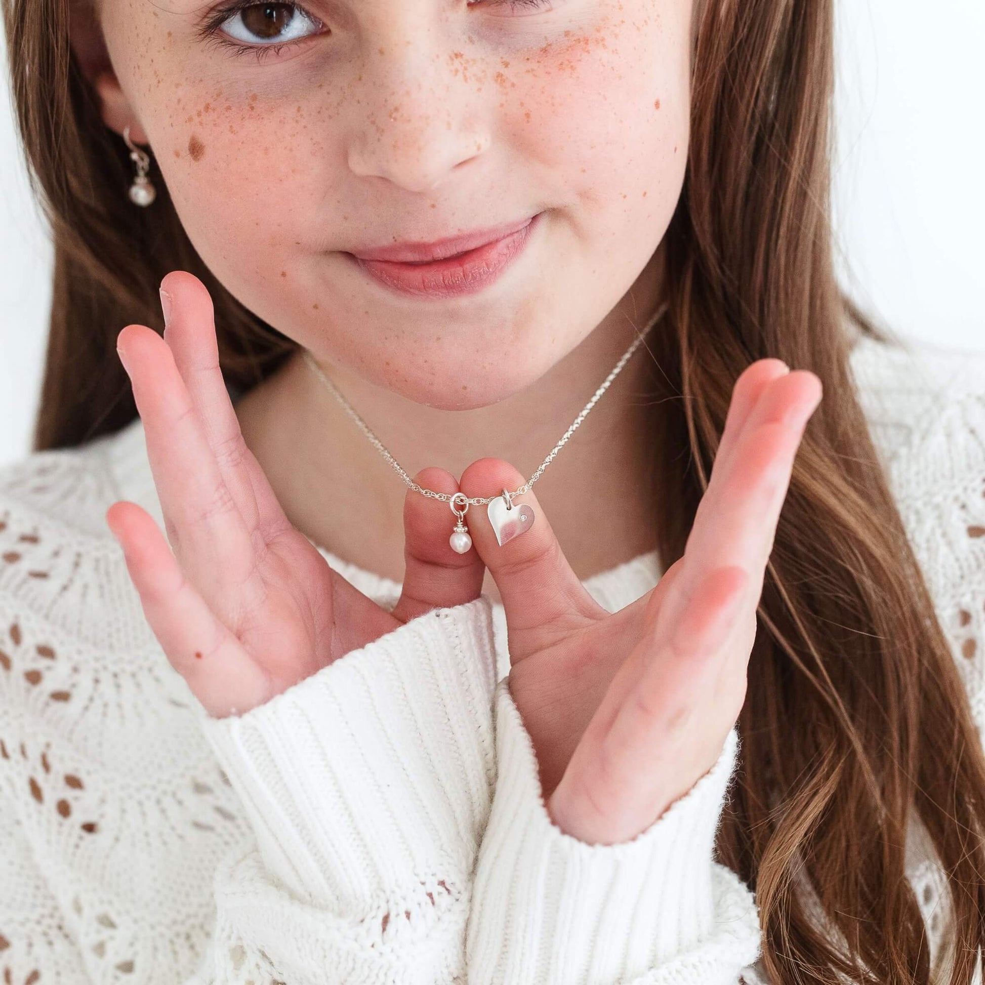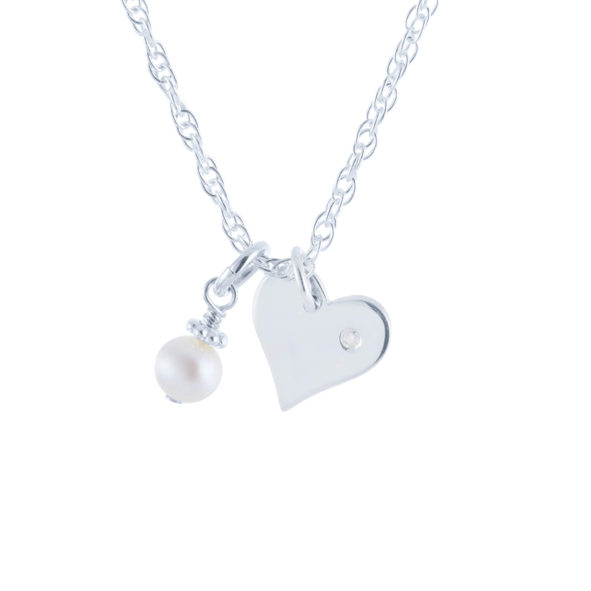 For the little girl who makes your own heart sparkle. This necklace features all of the most luxurious materials and just the right amount of innocence and play. Her classic pearl charm will dangle next to a sweet little silver heart charm (11mm x 13mm - fits on a dime) on a sterling silver double loop chain. A flash of sparkle comes from the itty bitty 1 pt real diamond embedded in her sweet little heart.