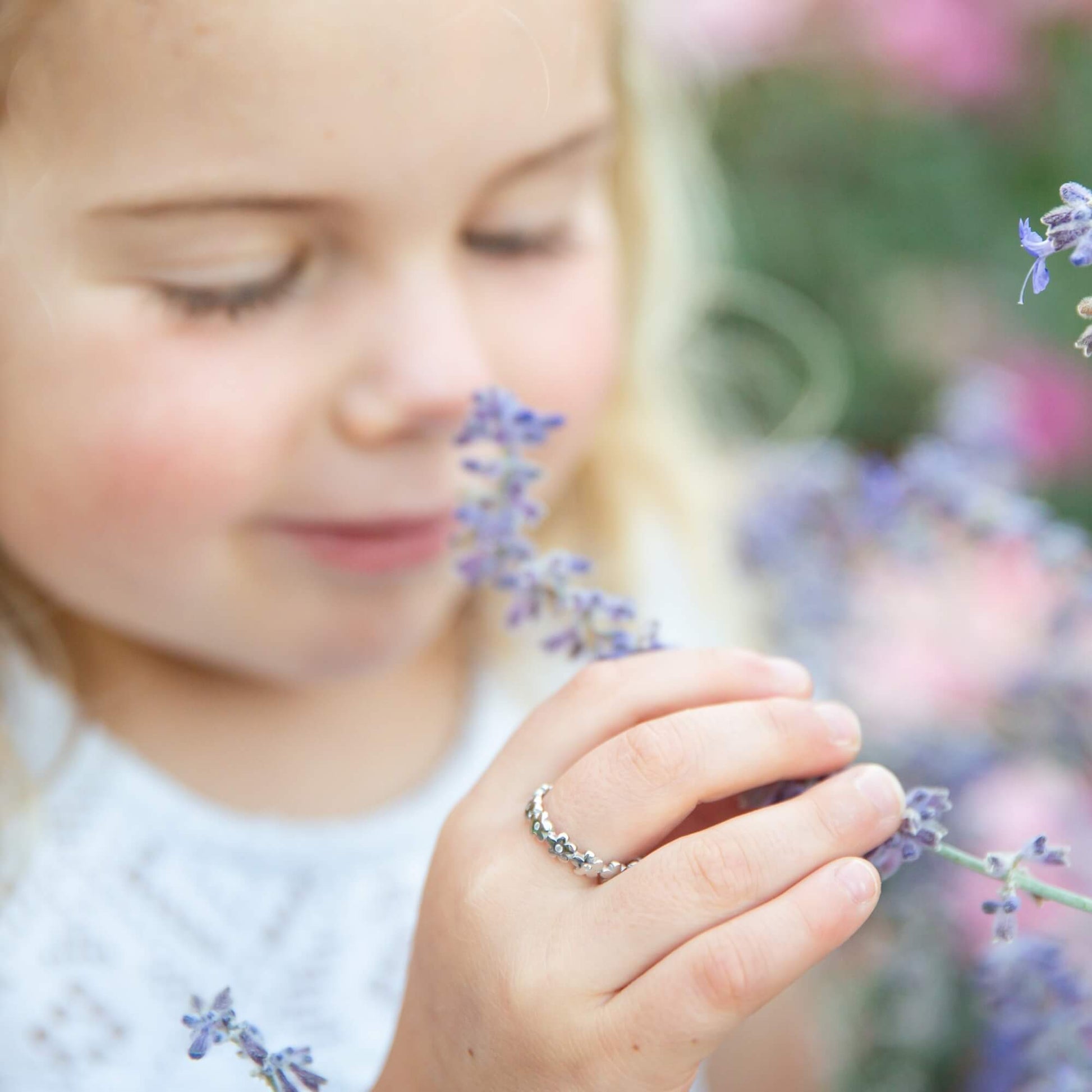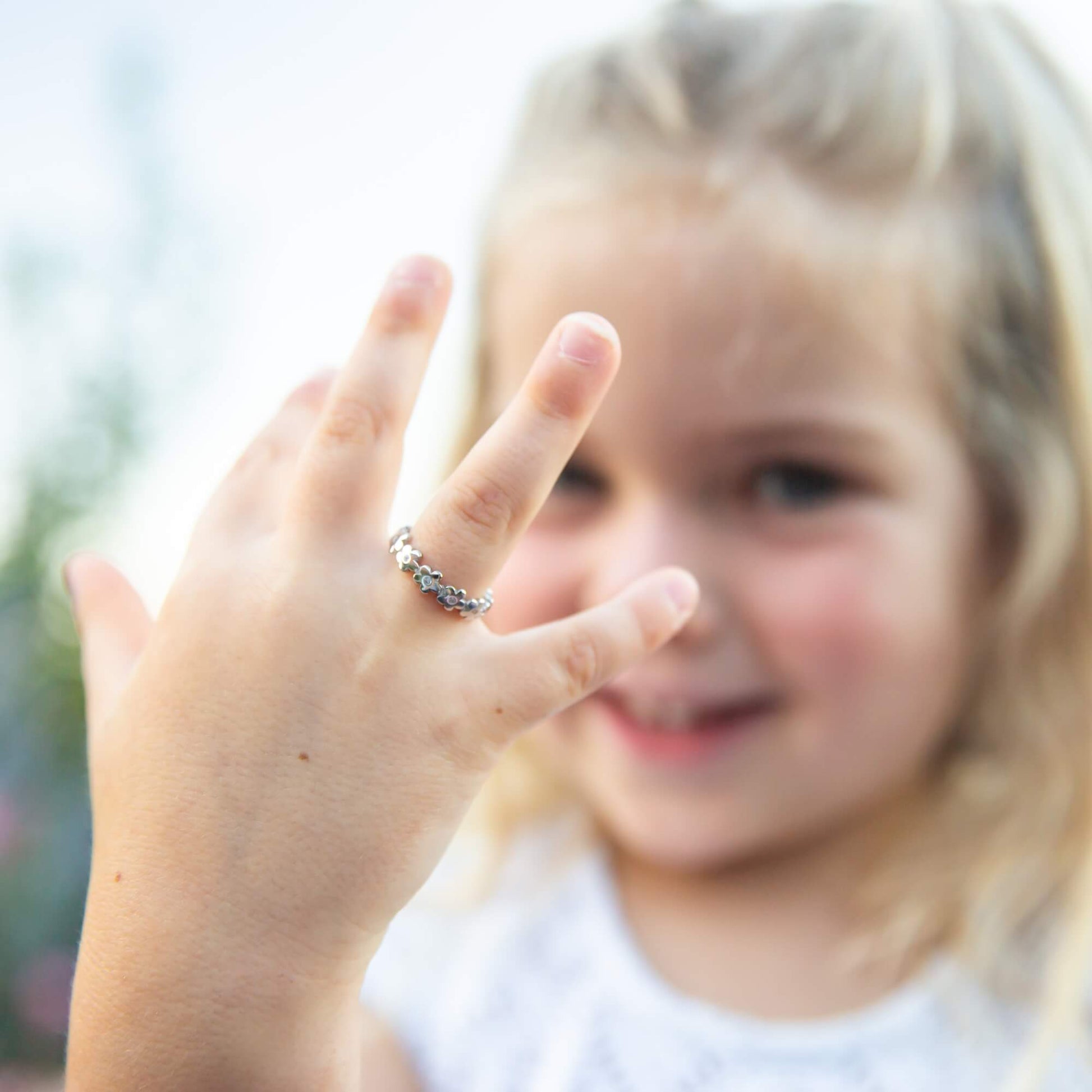 She can wear it on her thumb or middle finger now and move it to her other fingers as she grows. Her tiny child ring can also become a pinky ring as an adult. ♥