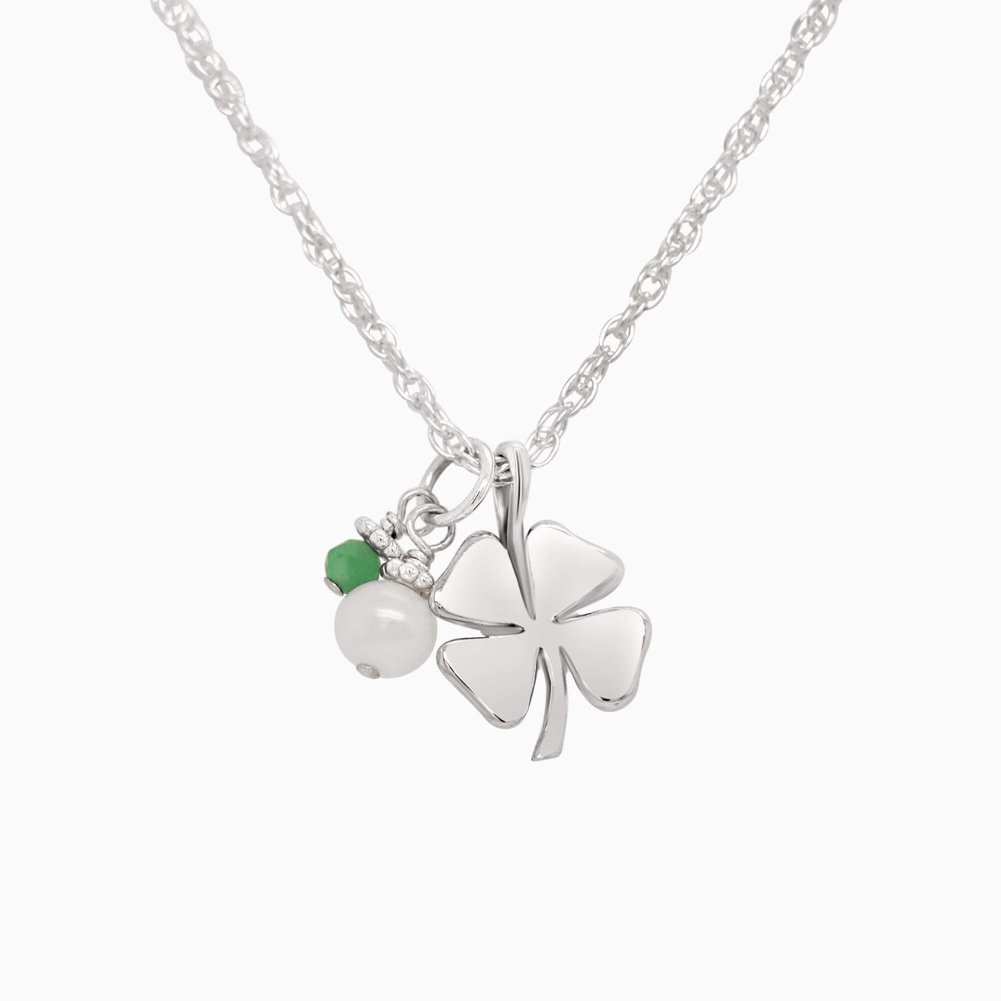 She is one lucky little lady! A petite (fits on a dime) shiny sterling silver four-leaf clover charm mingles with a gorgeous freshwater pearl and her very own special birthday gem. A wonderful and lovely reminder that she always carries her very own luck with her, on all of her adventures.