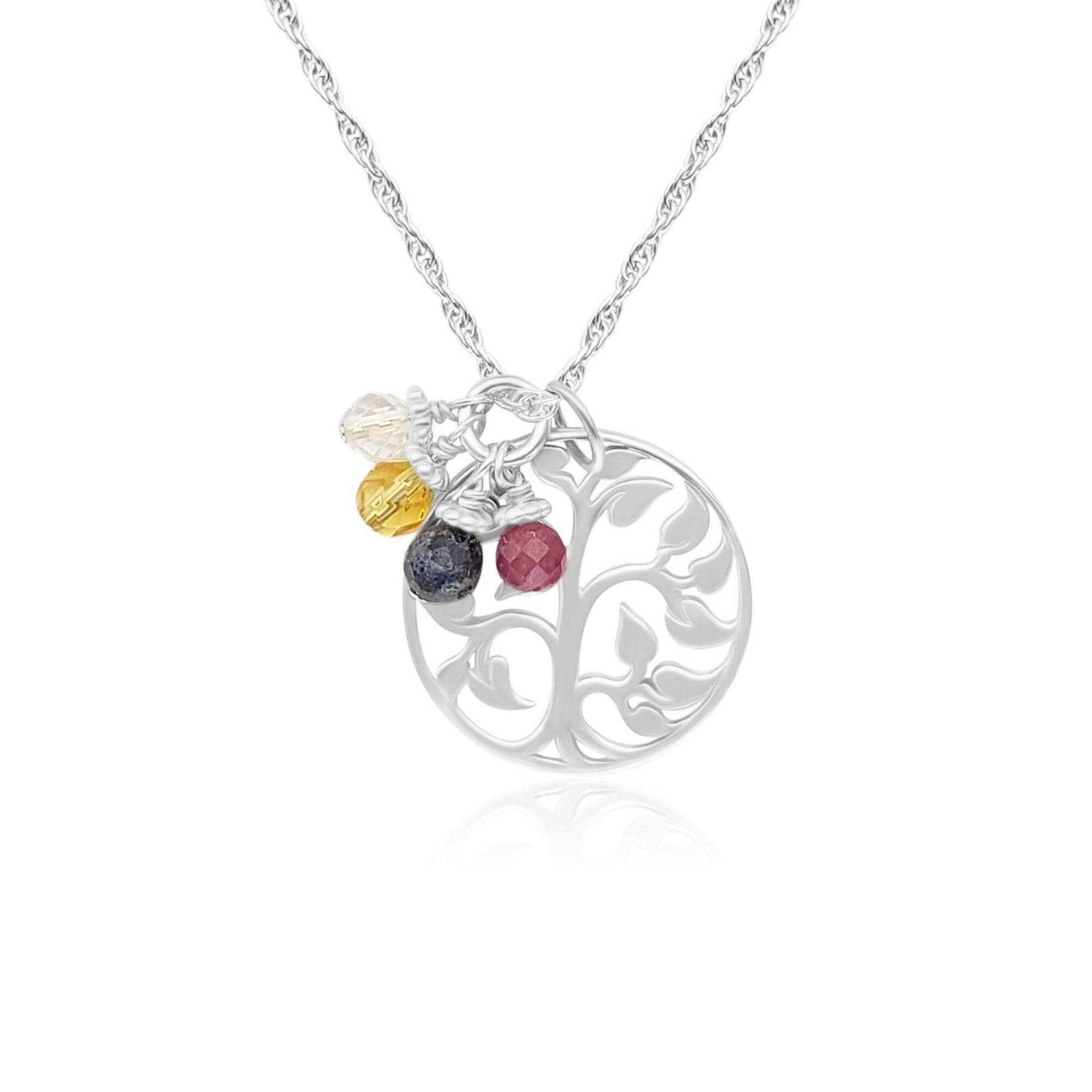 A gorgeous handcrafted 3/4" charm (about the size of a US nickel) features a family tree in solid sterling silver. A perfect gift for her wedding day with the bride and groom's sparkly birthstones. Then add extra charms as babies bless their lives.